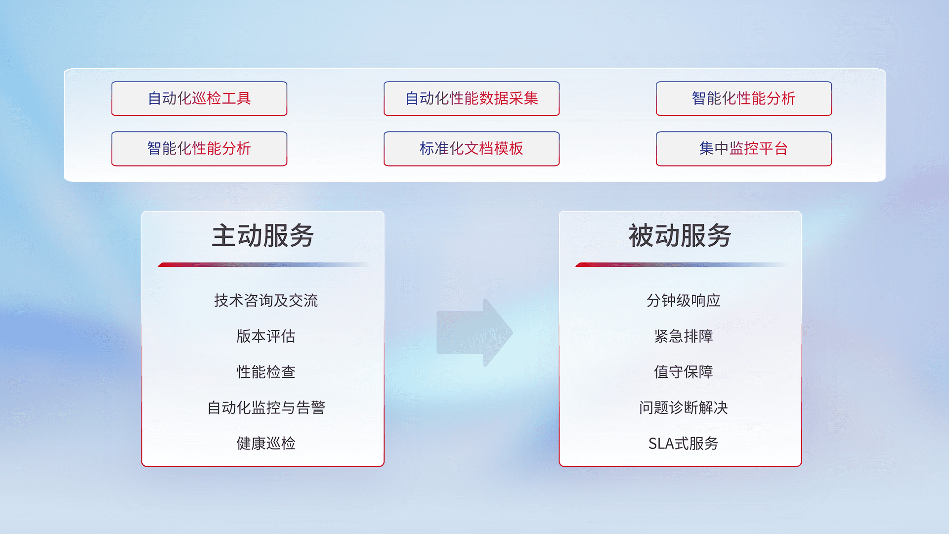 智能化工具和标准化文档,,,,保障服务质量,,,提供主动服务(包含技术咨询、、、、版本评估、、性能检查、、、自动化监控与告警、、、、健康巡检)和被动服务包含(分钟级响应、、紧急排障、、值守保障、、、、问题诊断解决、、、、SLA服务)。。